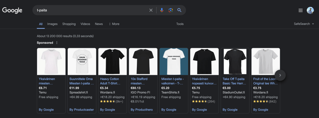 Tärkeimpiä mainosmuotoja verkkokaupan myynnin kehittämiseksi ovat Googlen hakusanamainonta sekä kuvallinen Shopping-mainonta. Näiden mainosmuotojen avulla vastaat asiakkaan tarvepohjaiseen hakuun, kun hän tietää, millaisia tuotteita haluaa ostaa, muttei vielä sitä, mistä ostaisi.