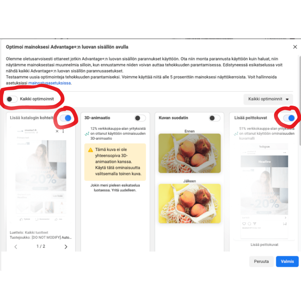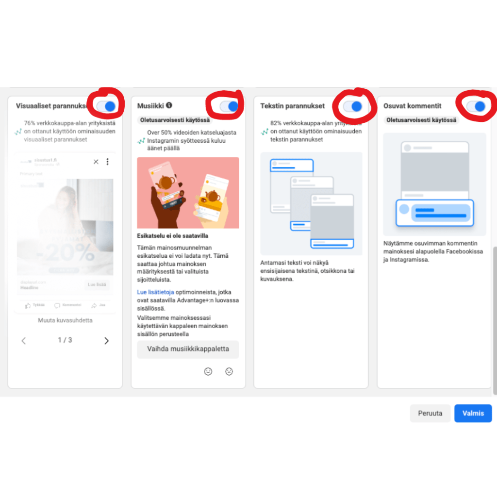 Nopealla vilkaisulla Meta näyttää että ”Kaikki optimoinnit” ovat pois päältä ja homma näyttää hyvältä. Tarkemmalla silmällä huomataan, että näinhän asia ei itseasiassa ole. Olet saattanut jättää 80% optimoinneista päälle. Saatat antaa Metalle vapauden säätää kuvasi kokoa, lisätä siihen aivan sattumanvaraisesti musiikkia tai vaihdella tekstien paikkaa. Eli loppupeleissä mainoksesi voi näyttää aivan erilaiselta kuin mitä olit kuvitellut sen näyttävän.