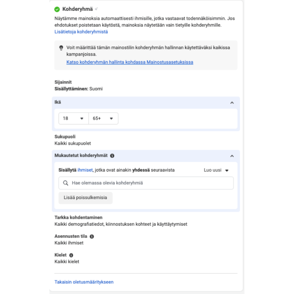 Mutta kun vaihdamme ”määritykseen jossa on enemmän asetuksia”, huomaamme että mainontamme oli lähtemässä koko suomen laajuudelle kaikille ikäryhmille ja kaikille kielille. Näihinhän ehkä kannattaisi jotain rajauksia kuitenkin vetää😉