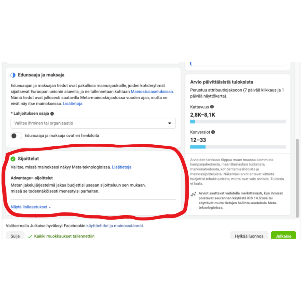 Meta on automaattisesti laittanut mainosjoukkotasolle Advantage+ sijoittelut päälle ja sinun tulisikin napata nämä sijoittelut pois päältä. Löydät nämä sijoittelut mainosjoukkotason viimeisimpänä asetuksena (tietenkin). Tästä pääset valitsemaan manuaaliset sijoittelut ja sitä kautta minimoimaan riskit mainonnan näkymisessä epärelevanteissa ja kalliimmissa mainospaikoissa. Toki Metan koneoppiminen on todella edistyksellistä ja on hyvin mahdollista (ja usein näin käykin), että mainos näkyy tuottavimmilla sijoitteluilla eikä budjettia kulu vääriin sijoitteluihin. Mutta sanoisin että better safe than sorry.